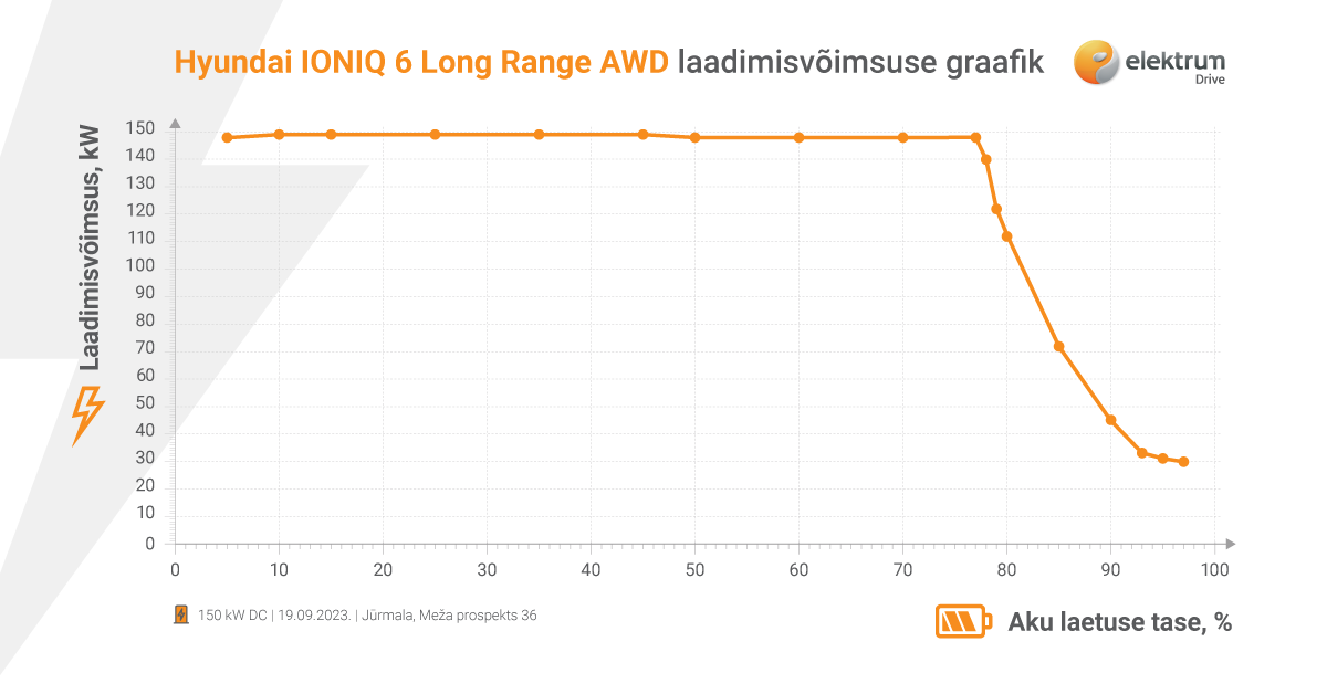 Keskmine laadimiskiirus kuni 80% 150 kW alalisvoolu laadimisjaamas