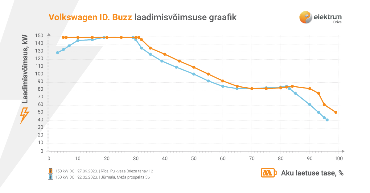 150kW DC laadimine talvel The charging data shown in the table were obtained at the ElektrumDrive 150 kW DC charging station in Rīga, 4 Muitas Street. The calculations assume an average consumption of 22.9 kWh/100 km obtained during the Elektrum combined mode test drive.