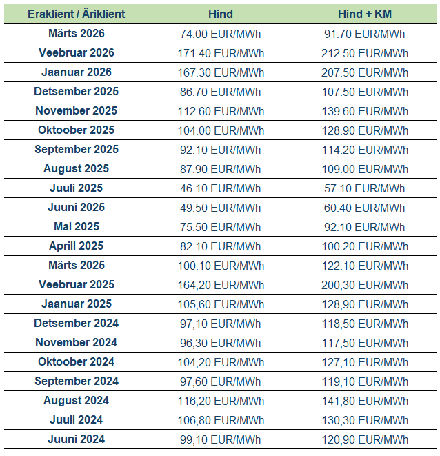 (ilma käibemaksuta) ja 9.63 €/MWh (käibemaksuga).
