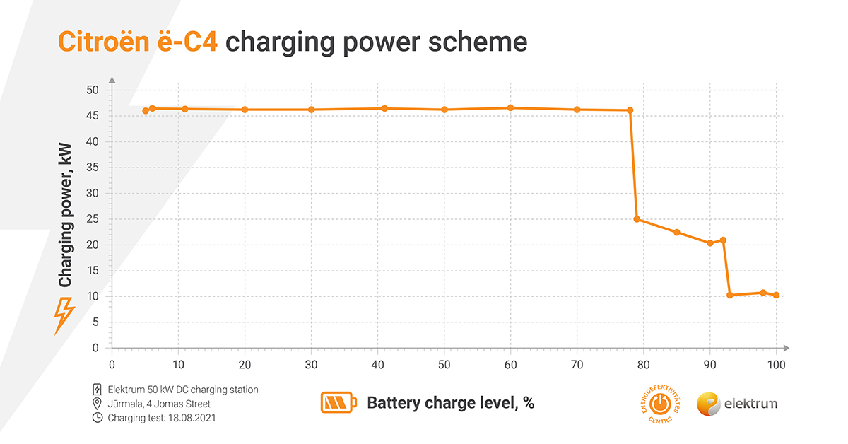 50kW DC uzlādeThe charging data shown in the table were obtained at the ElektrumDrive 50 kW DC charging station in Jūrmala, 4 Jomas Street. The calculations assume an average consumption of 14.3 kWh/100 km obtained during the Elektrum combined mode test drive.
