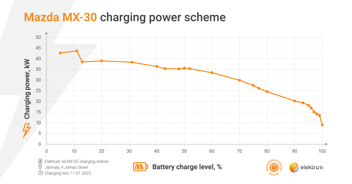 | Parametri | 50kW DC uzlāde Tabulā norādītie uzlādes dati iegūti Elektrum Drive 50kW DC uzlādes stacijā Jūrmalā, Jomas ielā 4. Aprēķinos pieņemts vidējais patēriņš 15.6 kWh/100 km, kas iegūts Elektrum kombinētā režīma testa brauciena laikā. |