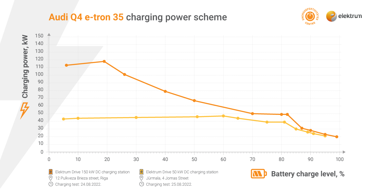 50kW DC charging The charging data shown in the table were obtained at the ElektrumDrive 50 kW DC charging station in Jūrmala, 4 Jomas Street. The calculations assume an average consumption of 21.1 kWh/100 km obtained during the Elektrum combined mode test drive.