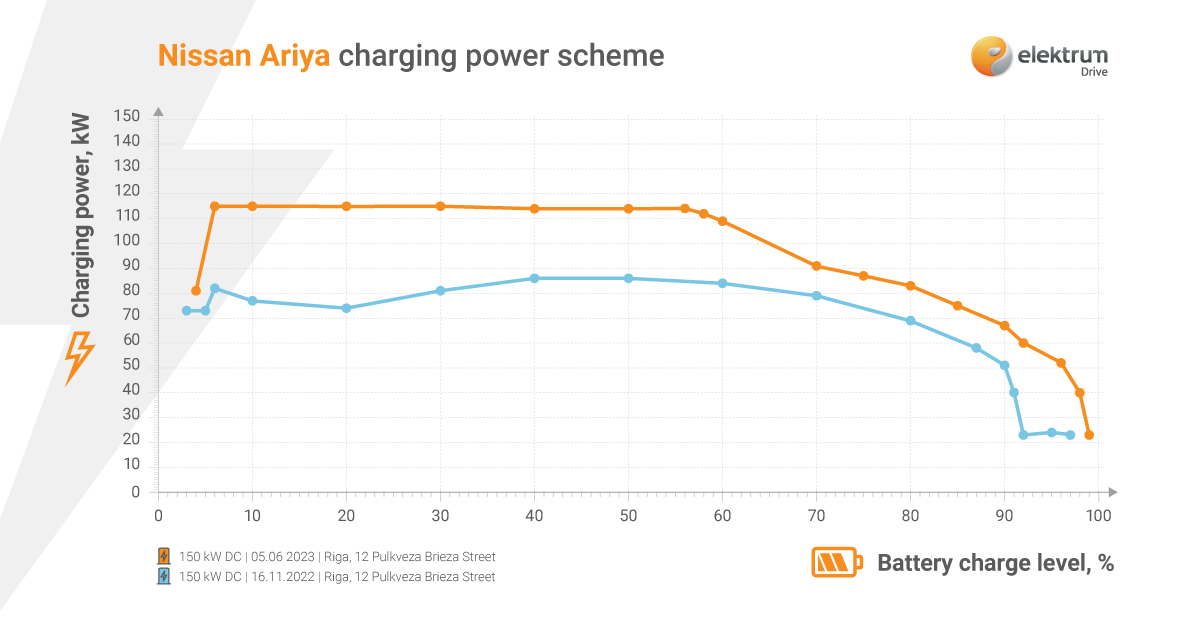 150kW DC charging summerThe charging data shown in the table were obtained at the Elektrum Drive 150 kW DC charging station in Rīga, 12 Pulkveža Brieža street. The calculations assume an average consumption of 16.0 kWh/100 km obtained during the Elektrum combined mode test drive.