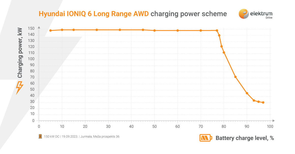 150kW DC chargingThe charging data shown in the table were obtained at the Elektrum Drive 50 kW DC charging station in Jūrmala, 4 Jomas Street. The calculations assume an average consumption of 14.9 kWh/100 km obtained during the Elektrum combined mode test drive.